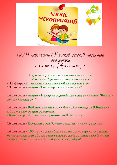 Ознакомьтесь с недельным планом Намской детской модельной библиотеки